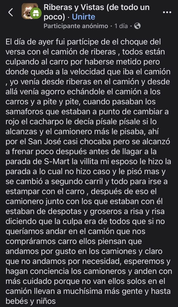 “Desde que salimos de Riberas venía echándole el camión a los carros y pite y pite. Cuando los semáforos estaban por cambiar a rojo, el cacharpo le decía ‘písale, písale, si lo alcanzas’, y el camionero más le pisaba. Ahí por el San José casi chocaba, y antes de llegar a la parada del S-Mart mi esposo le hizo la parada, pero no hizo caso y se cambió al segundo carril, todo para irse a estampar con el carro”.