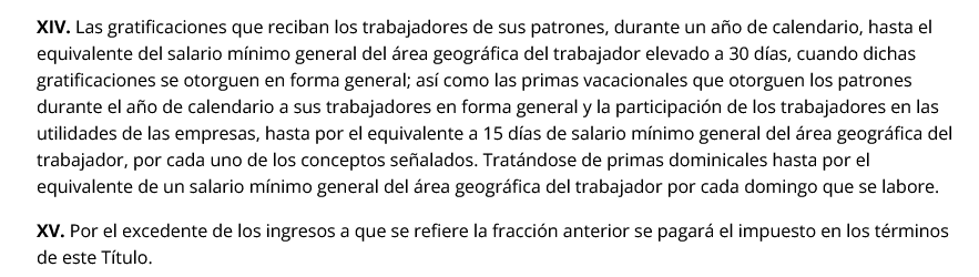 Desde 2014, la Ley del Impuesto Sobre la Renta (ISR), en su artículo 93, establece que los aguinaldos están exentos de impuestos “hasta el equivalente del salario mínimo general de 30 días”. Esto significa que solo si una persona recibe una cantidad superior a ese monto, el excedente paga ISR, como ha ocurrido en los últimos años.