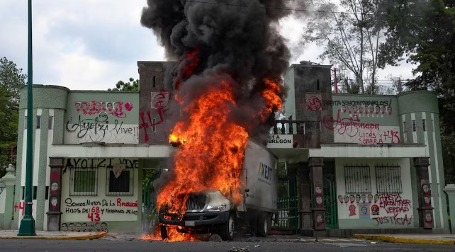 En la puerta 1 del campo militar quedó incrustada la unidad, lanzada de reversa, a la cual arrojaron explosivos caseros para avivar las llamas. Los presuntos normalistas también realizaron pintas en la fachada: “Ayotzi vive +43” y “Hasta encontrar la verdad y justicia”.