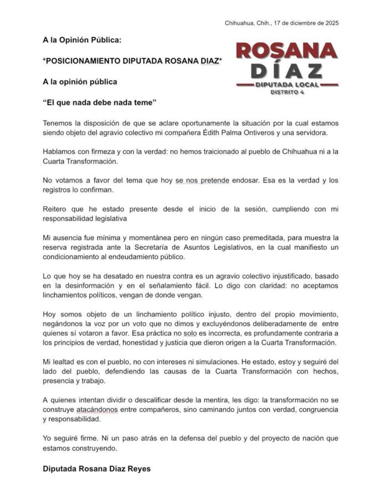 La diputada de morena Rosana Díaz lanzó un comunicado a la sociedad chihuahuense por medio de su Facebook, pero se trata de un mensaje unidirectional, ya que bloqueó los comentarios evitando así que los chihuahuenses pregunten sobre su actuar.